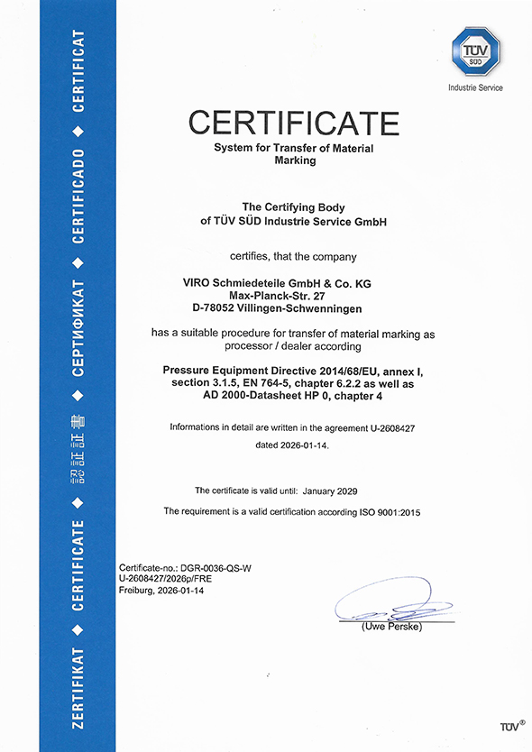 Transfer of material marking according to Pressure Equipment Directive 2014/68/EU, annex I, section 3.1.5, EN 764-5, chapter 6.2.2 as well as